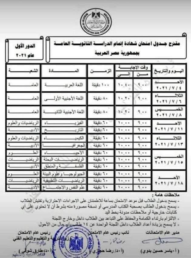 اعتماد جدول امتحانات الثانوية العامة للعام الدراسي الحالي.